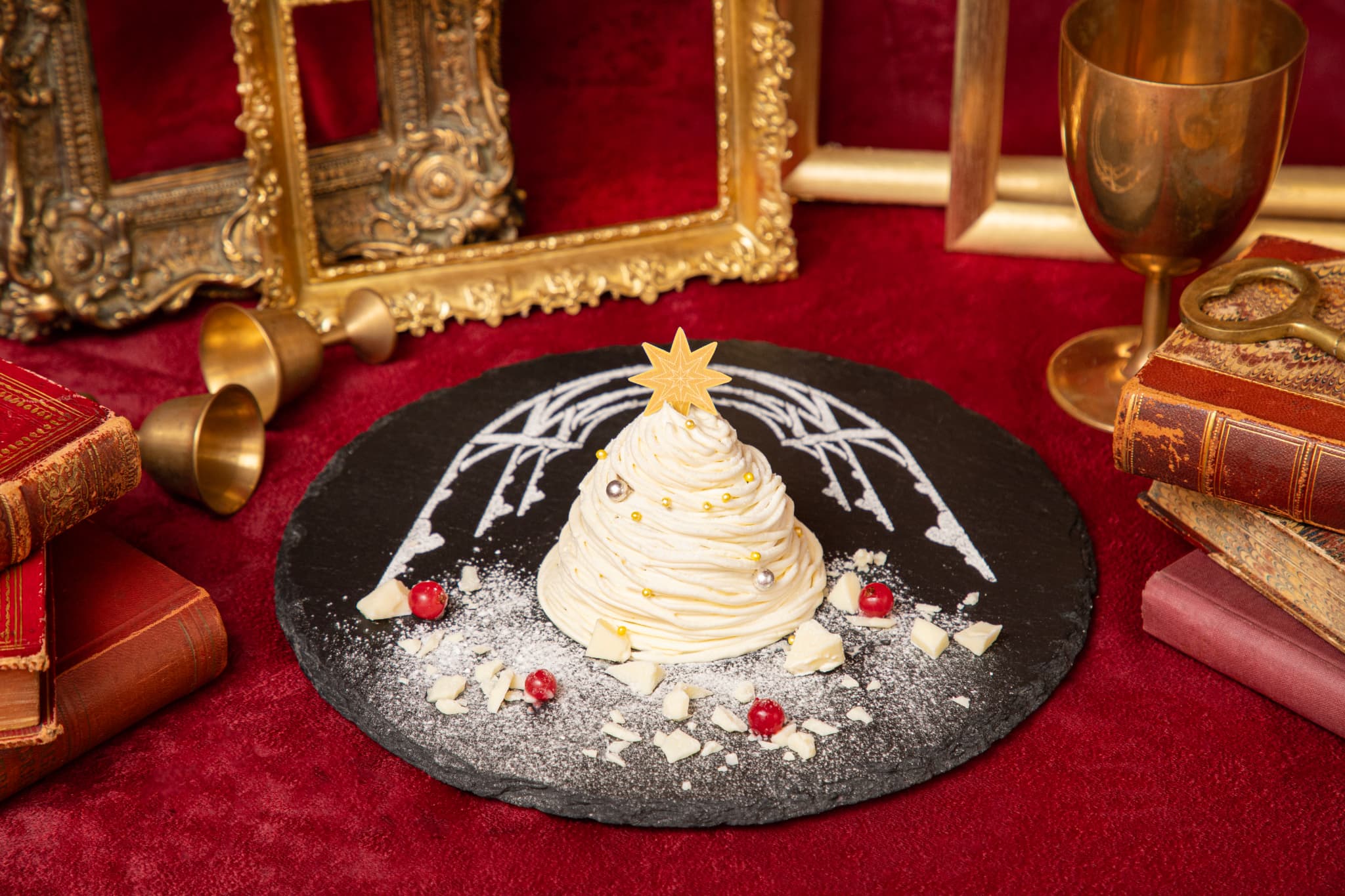 モンブランに雪のように粉糖をかけ、ユールボール・クリスマス・ダンスパーティーのツリーをイメージしました。